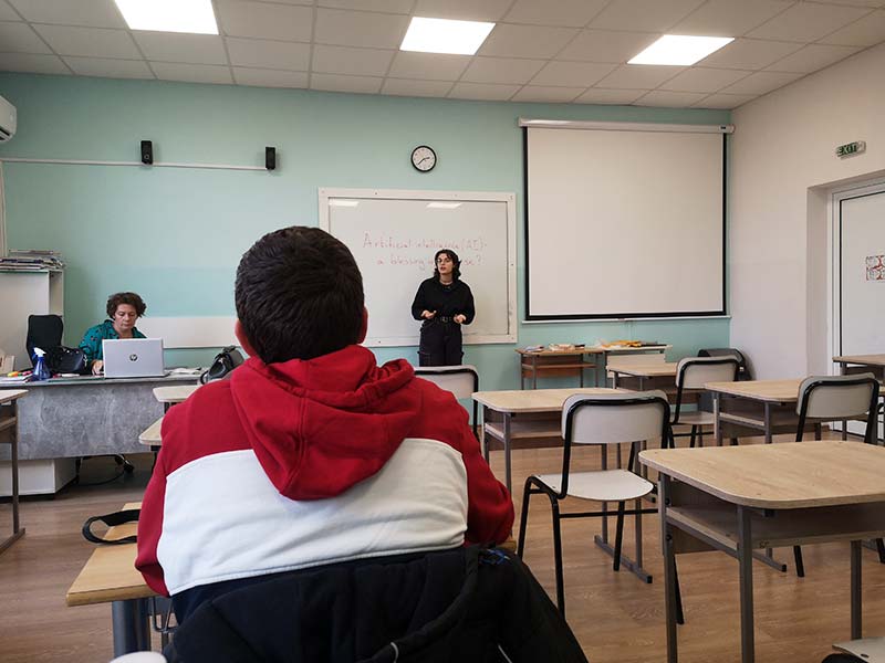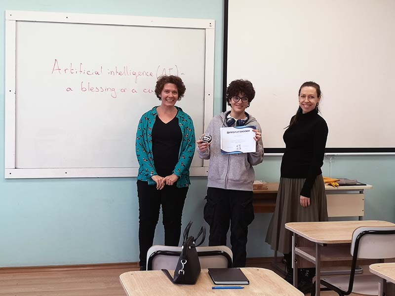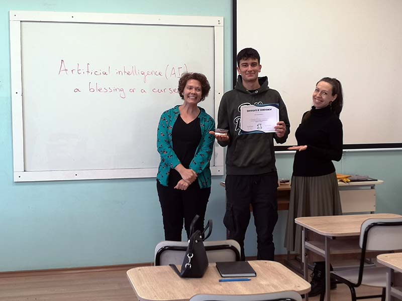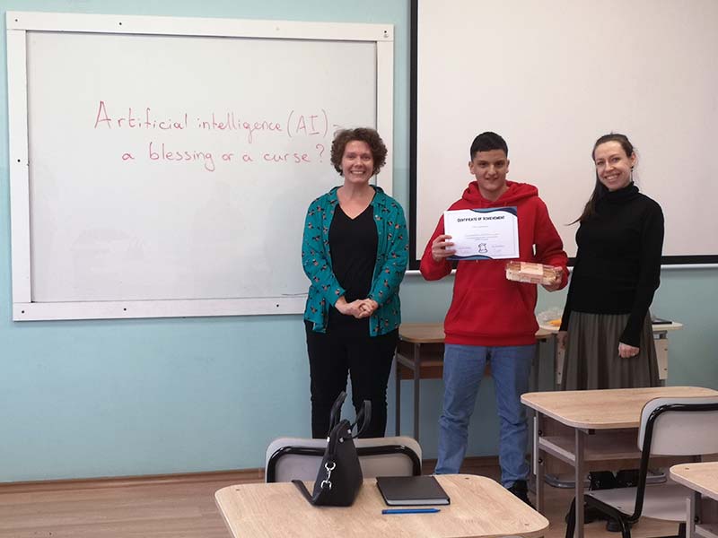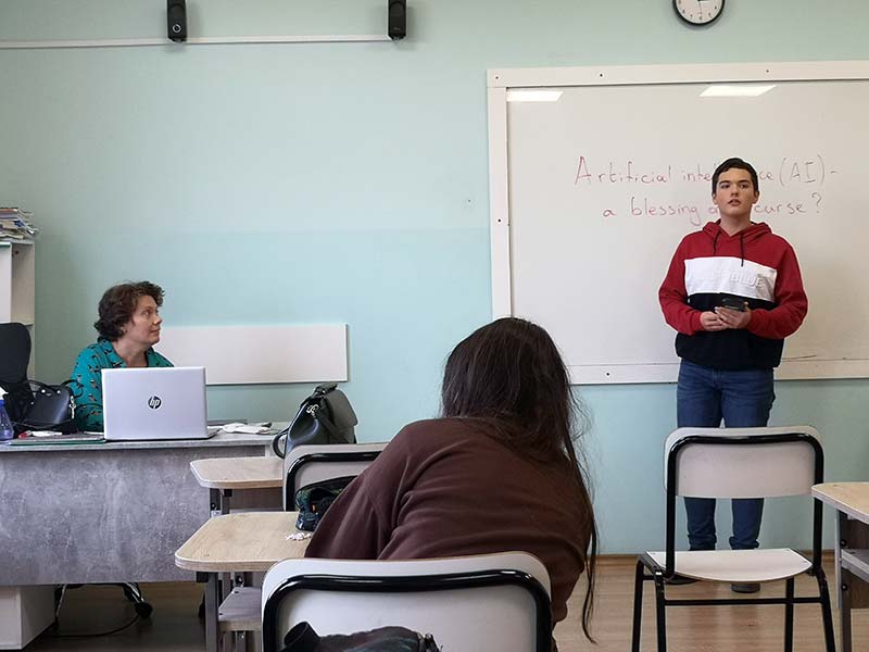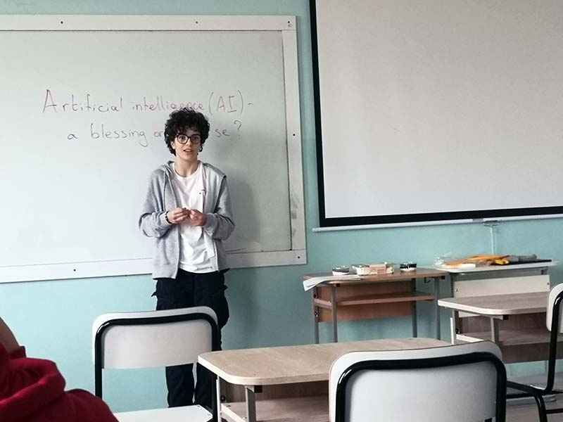 В проведеното състезание ученици от 8-ми до 11-ти клас премериха своите ораторски способности по актуалната тема „Изкуствен Интелект – благословия или проклятие“. Журито в състав Габриела Цойнска, Станислава Борисова и Гергана Христова, имаха нелеката задача да изберат трите най-добри кандидатури. Децата споделиха широк спектър от мнения и идеи, в които проличаха не само отличните им езикови умения, но и способността да говорят уверено пред публика. Голямата награда отиде при Александър Иванов от 10-ти клас, който впечатли журито с богат речник, увереност и креативност. Второ и трето място бяха заети от Соня Младенова от 8-ми и Йордан Димов от 11-ти клас.
