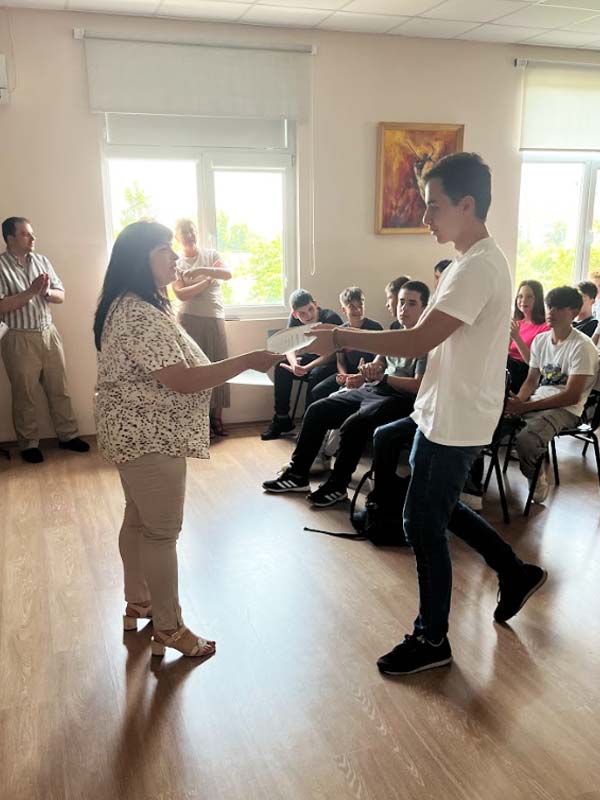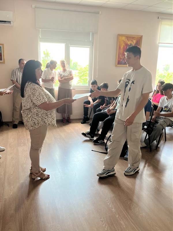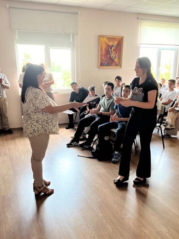 В подобаваща за събитието радостна атмосфера наградените ученици бяха топло поздравени за своите усилия и постижения от директора на училището г-жа Рени Митова. Беше изтъкнато доброто представяне на децата, спечелили участие в националния кръг – Борянa Ненкова и Мия Иванова (в ниво B2), Николай Василевски (B1) и Ева Георгиева (А1-Senior). Не беше оставено без похвала и стореното от Дарина Кирчева, стигнала до бараж за участие в националния кръг в ниво B2. Кратко представяне на самото състезание изнесе г-н Веселин Йоргов, главен координатор за провеждането му в структурите на нашето училище, който отправи и насърчение към останалите ученици на гимназията за участие през следващата учебна година.