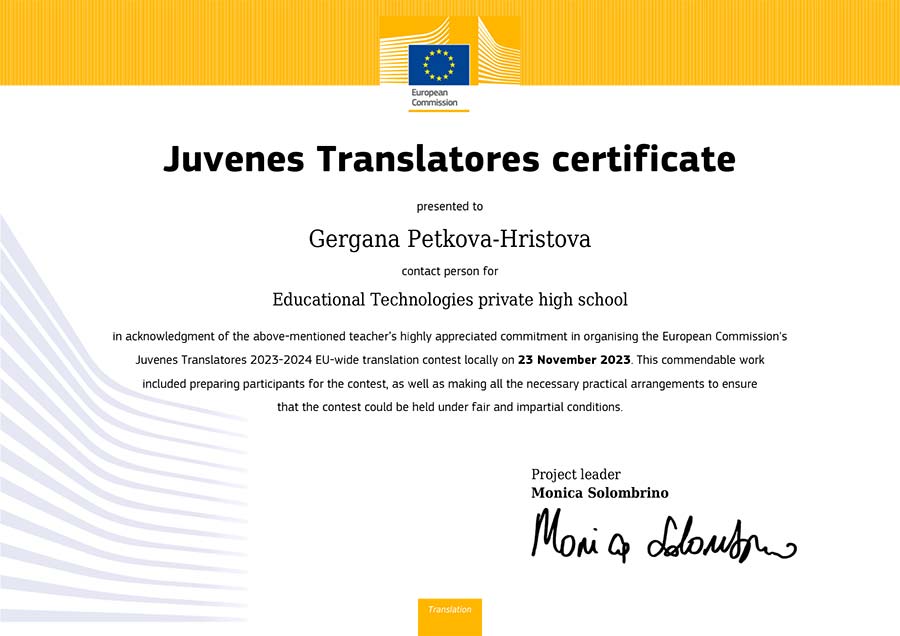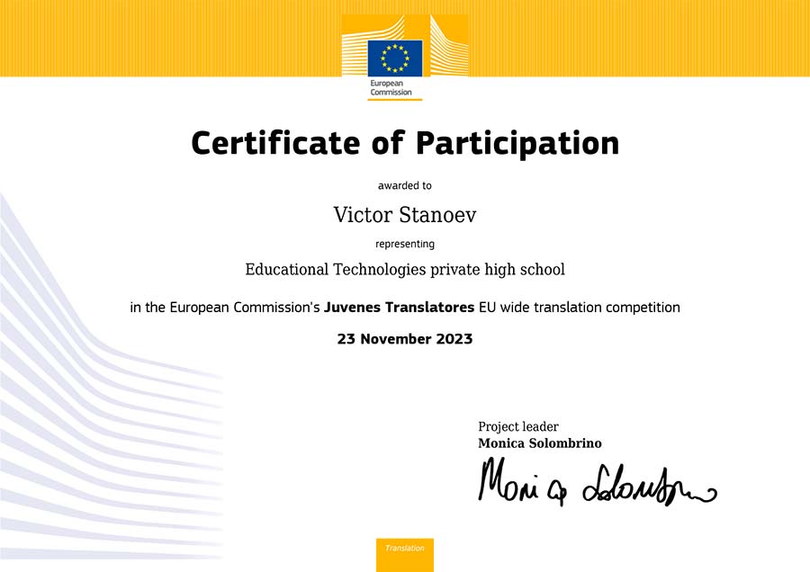 На 23 ноември ученици от 11. клас на ЧПГ „Образователни технологии“ взеха участие в международно езиково състезание по превод под егидата на Европейската комисия. Темата на текста за превод тази година беше свързана с изкуствения интелект. Благодарим на Винсент Тодоров, Ивайло Пашов, Йордан Димов, Виктор Станоев и Максим Николов, че представиха достойно гимназията в това престижно международно събитие.